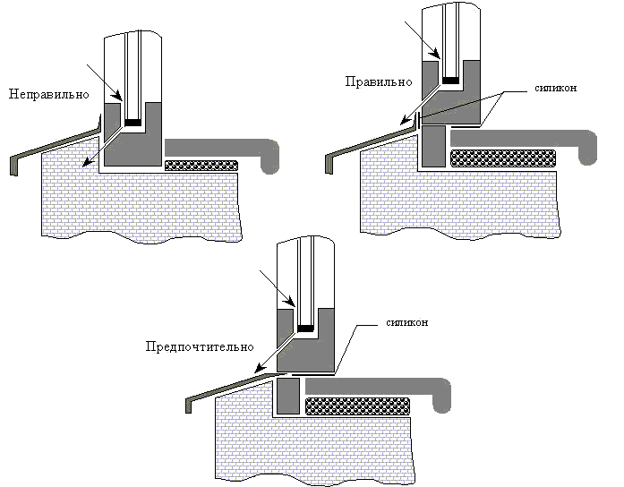 Никогда не забывайте, что с наружной стороны окна снизу (а иногда и сверху) должен быть установлен отлив для отвода дождевой воды. Поэтому нижняя кромка коробки окна должна быть не ниже наружного края проема (независимо от способа установки отлива). Это необходимо для того, чтобы гарантированно не перекрыть специальные водоотводные отверстия на наружной стороне оконной коробки. Кроме того, стык между отливом и рамой (равно как между подоконником и рамой) обязательно следует герметизировать, например, силиконом. А вообще, отлив желательно устанавливать под окно, дабы исключить любую возможность просачивания воды в месте их соединения. Не следует также забывать и о подоконнике, который следует тоже устанавливать под окно (а не встык к нему), и герметизировать силиконом, что, с одной стороны, увеличивает механическую прочность соединения, а с другой – не допускает просачивания влаги через стык под подоконник. (Рис.4)